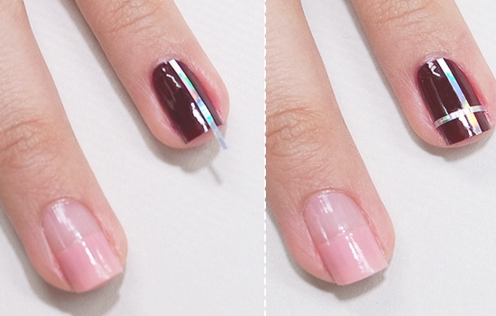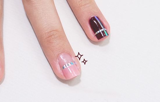 STEP4:把细长条贴纸贴在中指甲油交界处。
