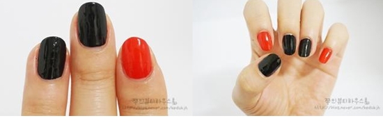 STEP2:把5个指甲挑选2个涂红色,另外3个涂黑色打底。