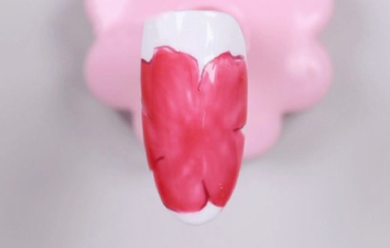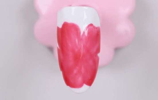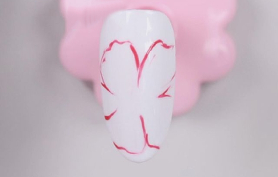 先为甲面做一个白色的打底。把红色甲油胶和封层调匀,用小笔沾取之后,画出花瓣的轮廓。