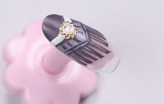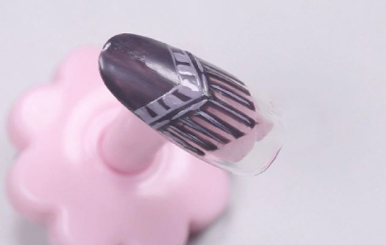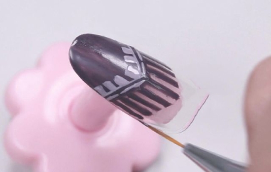 好了~现在我要开始画流苏了!用小笔沾取和“V”型底色一样的黑紫色,画出中间的一条流苏。为了定出流苏的大概长度,我们画一条和“V”平行的辅助线。然后继续画流苏~每条流苏的宽度要差不多哦,要是一宽一细就会变得很奇怪啦!画好流苏后,用光疗笔沾一点点清洁剂,把辅助线抹掉。照灯。