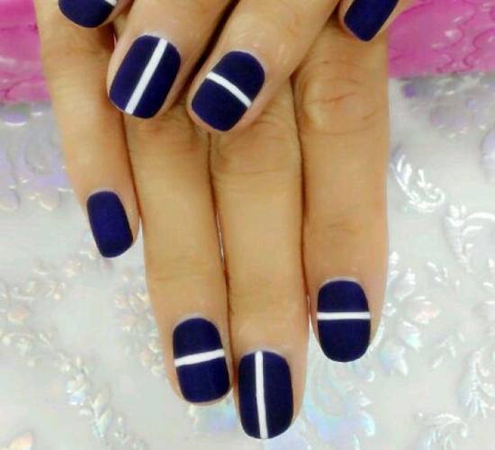 这款磨砂美甲图案很简单,白色随意插在美甲之中,藏蓝色与白色的配色明快简单,不厚重。哑光的磨砂质地,增添了成熟味道,上班的女强人不妨试试这款磨砂美甲。