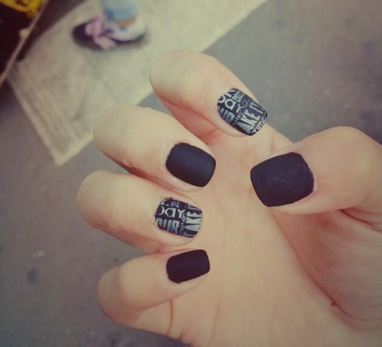 哑光的黑色甲油打造出磨砂的质感,大小不一的英文字让美甲充满个性范,这款精致的磨砂美甲会很适合个性机车少女。