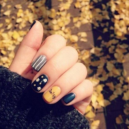 这款文艺范的小雏菊美甲,跟秋天的落叶很是应景,也符合秋季的气质,这款美甲由四个四色搭配组成,墨绿色、灰色、黄色、黑色。很文艺的配色。喜欢文艺的妹子可以马上拉~~