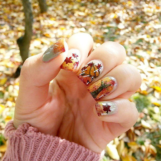 枫叶也是秋季里一个很美好的元素哦,这款枫叶美甲,就是把秋季画在指尖上的感觉,看似复杂的图案,其实也不难,混合的色彩底色。加上小笔勾勒枫叶就可以了。看看,是不是落叶的背景上一点也不违和呢?还显得手白哦!