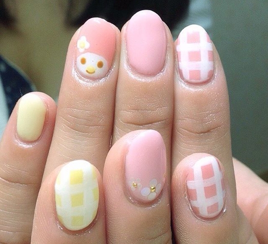 果冻色的色彩质地,粗粗的格子展现出小清新的味道,再在指甲上描出一张笑脸,用白色小花做点缀,wow!这样的美甲可爱又清新,一定很讨人喜欢!