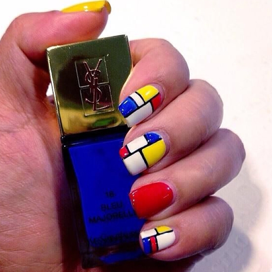 这款美甲选用了,靓丽的黄色、白色、蓝色和红色,是比较典型的波普风格颜色,以格子的形式填充,很西方风格的一款格子美甲图案。很时尚的颜色搭配,也是很白搭的一款短指甲美甲!
