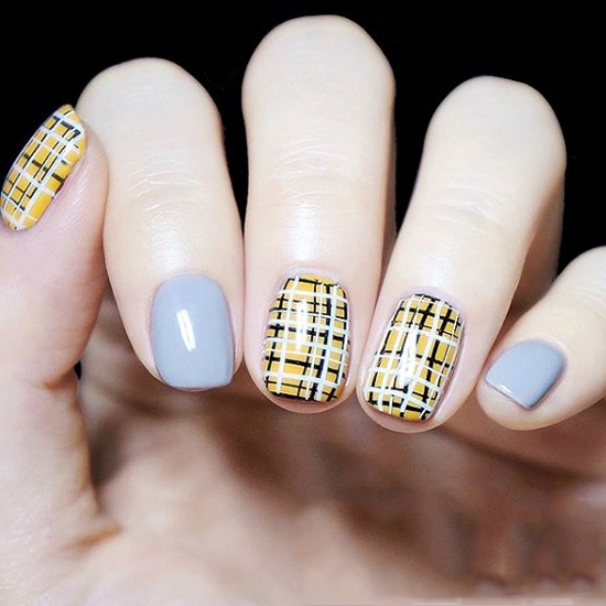 看完了个性时尚的格子图案,来看看这款,文艺气息十足的格子图案,除了在格子画法上的文艺,主要还是在颜色搭配上,选择的是淡黄色和灰色的搭配,很有文艺气质。也是很适合秋冬季节的一款美甲!