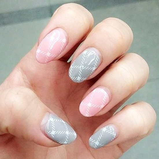 粉色和灰色搭配,显得这款美甲格外的优雅,再配上淡淡的格子纹路,整个美甲很丰富!就连这样的短指甲涂上也是超级好看的!不过,建议这款美甲比较适合手白一点的人涂上!