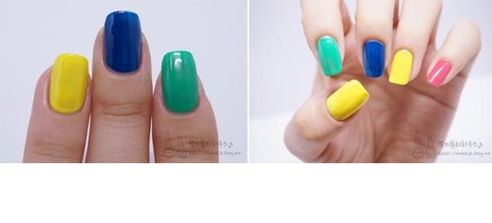 STEP2:把这几款红黄蓝绿甲油粉饼涂上指甲,吹干待用。