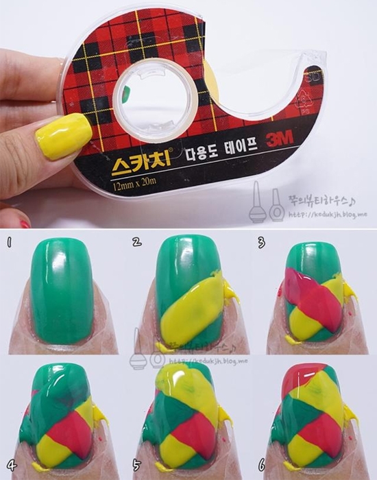 STEP3:用透明胶带把指甲周围的手指包裹住,防止擦拭指甲底部损坏形状;把其他不同的两款颜色交叉叠加涂抹在底色上,注意每次都要干透后才能涂另外的颜色