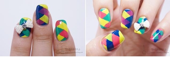 这款韩式的糖果色的五彩美甲,除了在闪亮的夏季很适合之外,这样灰蒙蒙的秋冬季节也是一种极佳选择,使用不同颜色线条交叉的格子图案,混搭出艳丽的色彩,和秋冬季节的色彩十分应景!