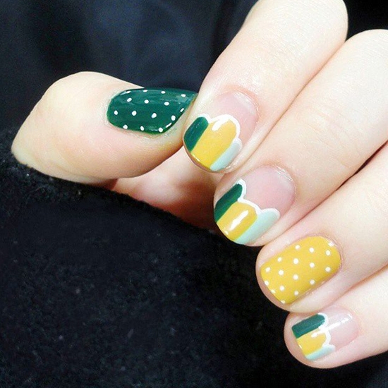 秋冬季节里出现了小清新的绿色和黄色搭配,也能给人眼前一亮的感觉哦。这里的这款美甲就是,同时还有小圆点的元素,不止是清新,还有可爱哦,这两种颜色也是超级显手白的颜色!
