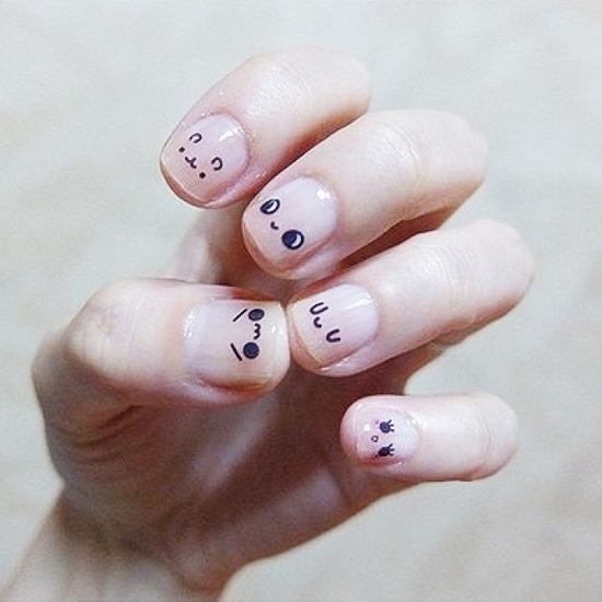 裸色是最接近肤色的,也是很显手白的一款美甲色,在这样的颜色上面画上卡通的小眼睛、小鼻子、小嘴,一款可爱的表情美甲,就这样完成了!被卡通化的表情是不是更能萌化人心呢?