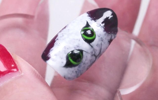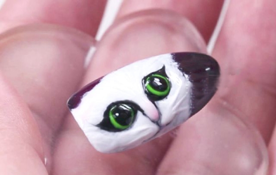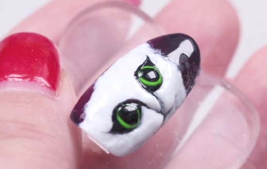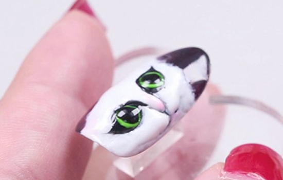 用小笔沾取白色甲油胶,点出眼睛反光的地方,再画出胡须,额头的地方也画出一点毛发的感觉,所以我们粘甲油胶要多沾一点,就可以让毛发有立起来的感觉,猫咪就会更逼真了~毛发如果不够突出的话要重复上色,不然一刷封层就看不见啦!照灯。最后刷上封层就完成啦~