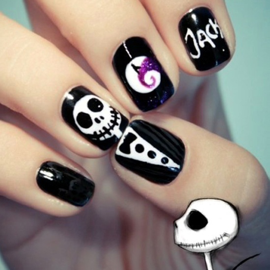 除了上面的骷髅头图案美甲,这里一样使用了骷髅头,只是不一样的做法,这里是以骷髅头先生为主,分成上、下半身来分开描绘的,是不是很有创意呢?比较嘻哈风格,骷髅头元素,在万圣节里面是百搭款啊!