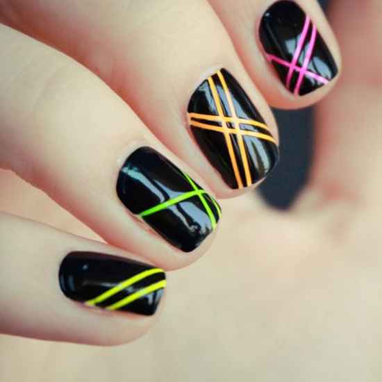 黑底彩色线条美甲