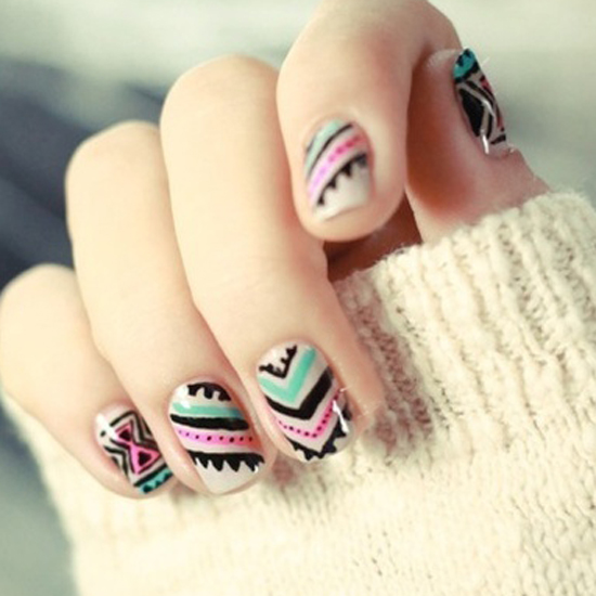 看惯了上面的一些列黑色系,下面给大家介绍这款以黑色搭配的民族风印花图案美甲吧!使用了复杂的线条图案,排列组合在一起,形成了独特的美感,不怕麻烦的孩子可以尝试一下这款,还是十分值得拥有的!