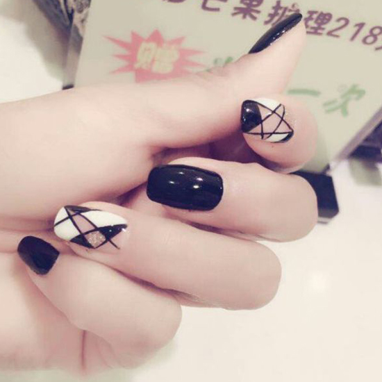 很有个性的一款黑色美甲,有白色搭配,有留白的本色。形成了不规则的格子图案,很百搭的一款黑色美甲,个性十足哦。喜欢的就去尝试吧!