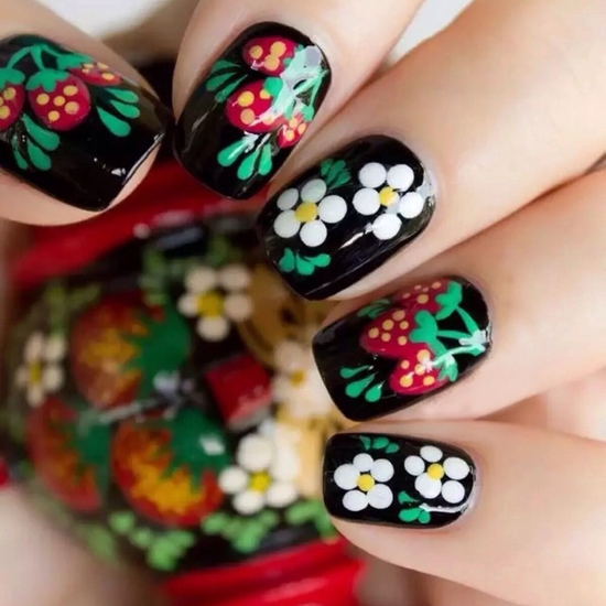 在纯黑色的底色上面画上艳丽的图案,是不是很有日本原宿风格呢?看这款美甲的图案,也不失很复杂,颜色上选择的是比较艳丽的颜色搭配,红色和绿色黑色的强烈对比,加上图案结构的复杂化,这款美美哒的日本原宿风黑色美甲就这样形成啦!