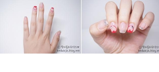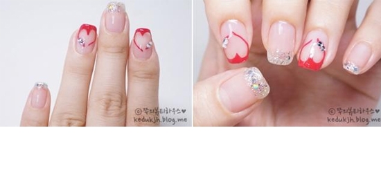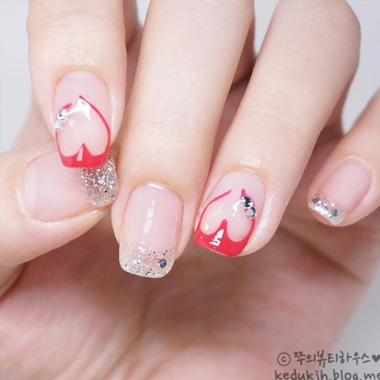 这款法式半透明美甲结合了心形的图案,而且这颗心是空心哦,很有创意吧!以红色搭配了亮片透明色的甲油,整个美甲也不会单调,层次更加丰富了,而且红色和透明色都会显得手很白,简单的图案也是百搭款的美甲图案。搭配红色、黑色、白色的衣服都很漂亮哦。快把它学走吧!
