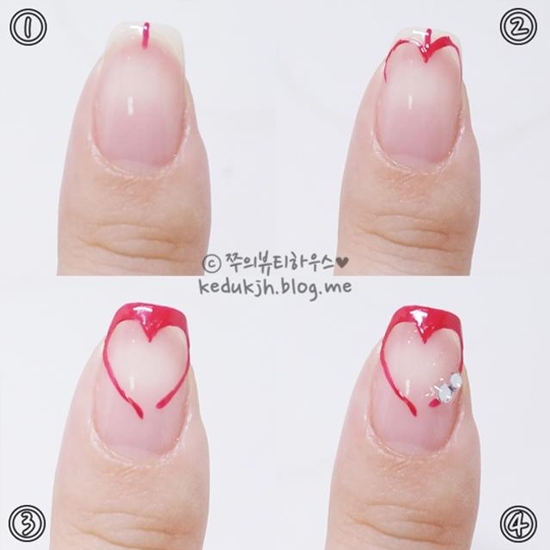 STEP2:现在教你画小心心~在指甲中间画上一笔后,以此为中心点向两侧画弧线后在中间靠下位置汇合,指甲头涂满红色,再贴上2颗小亮钻。