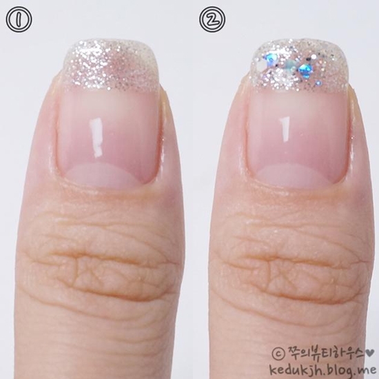 STEP3:在另外的指甲上1/3位置先涂上银色小亮片,吹干后在叠加上大亮片。