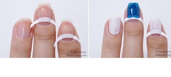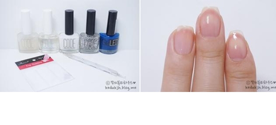 STEP2:因为做的是倒法式,所以要把法式贴纸贴在靠下的位置,然后涂上白色和蓝色甲油。