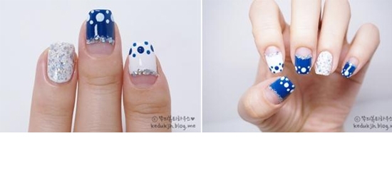 STEP4:白色的倒法式上再用蓝色圆点点缀,全涂满的白色指甲上可以再涂上一层银色小亮片,5个手指有了3种图案了。