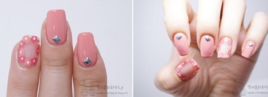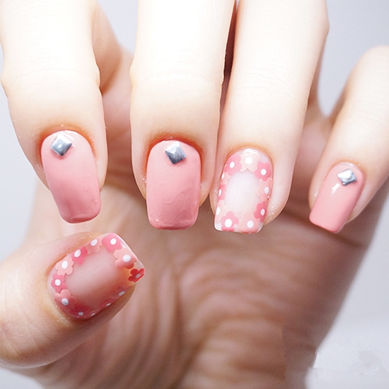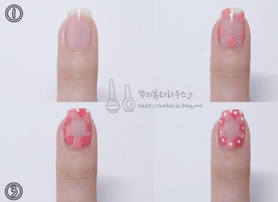 STEP3:在只涂了底油的指甲上,沿着指甲边缘先画上裸粉色的花朵,隔开空出的地方画上豆沙粉的花朵,最后哟个白色点缀花芯。