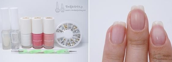 STEP1:准备好白色、豆沙粉、裸粉色指甲油,先涂好透明的底油。