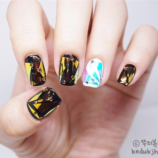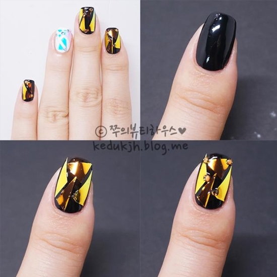 STEP3:把贴纸贴在黑色和白色的指甲上,因为底色的不同,贴纸反射出来的色泽也不相同了~再搭配上一些小珠子作为点缀。