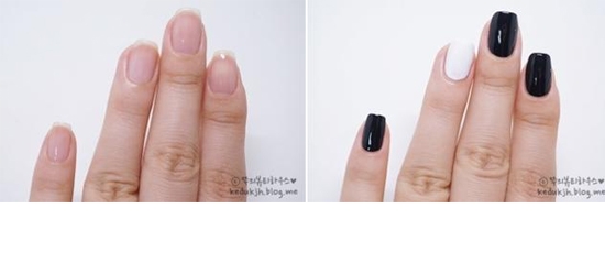 STEP1:先涂好透明底油后,将指甲分别涂上黑色和白色作为底色。