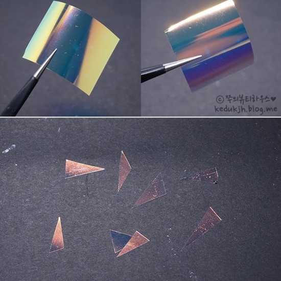 STEP2:去除一小片贴纸,剪成各种不规则三角形,放着待用。