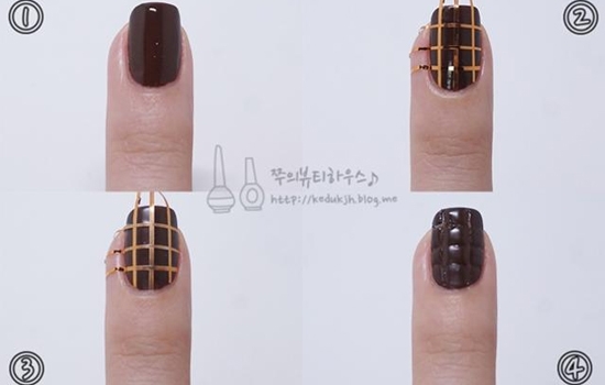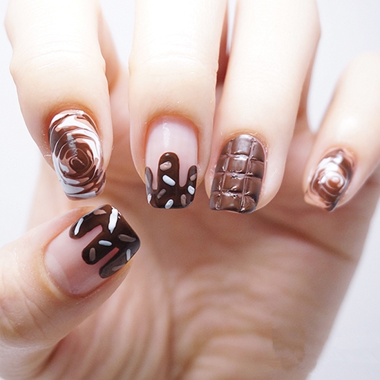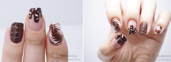 奶咖啡色的美甲如果采用纯色全涂,就会少了奶咖啡给人的美味感觉,因为巧克力色也属于咖啡色,所以这里采用了咖啡色的巧克力图案做法,整个图案搭配奶白色,看着很美味。还有巧克力、甜品的造型,美食感很强。还结合了巧克力块的形式,做成了格子图案。很百搭的一款美甲!这种把咖啡色美甲做的特别美味的感觉,也是是一种很新颖的创意哦。