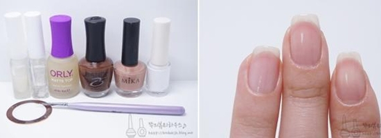 STEP1:准备好巧克力色、裸色、白色指甲油和画笔,先给指甲涂上透明底油。