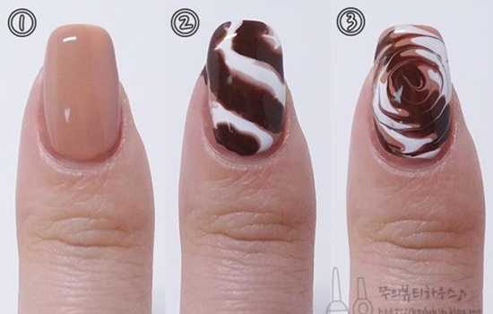 STEP2:涂好裸色打底,把白色和巧克力色像2那样交错涂好,刚涂好就立刻用画笔画圈搅动。