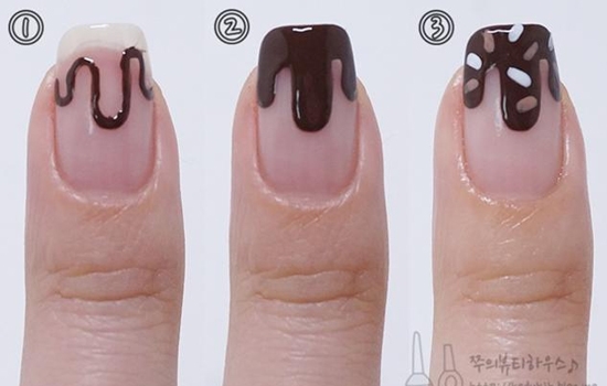 STEP3:这个指甲先用巧克力色画出山型,填满指尖空白的地方,干透后在用裸色和白色点上几笔。