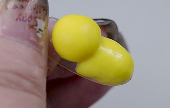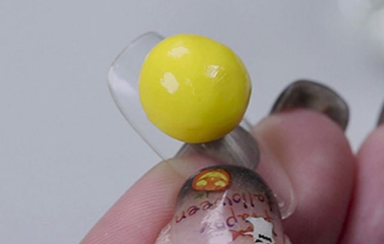 第一步:用压花棒取出适量的黄色雕花胶,放在手背上然后用手指把雕花胶搓成小球,然后再取出放在甲面的中间,用雕花笔调整一下形状,要保持小球的形状呢!这是哆啦美的头~照灯。