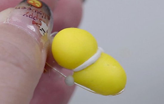 第三步:取出白色的雕花胶,搓成条状,放在两个黄色雕花胶的交接处,用雕花笔轻轻的把它调成到较为服帖的状态,这是哆啦美的项圈哦~照灯。取白色雕花胶,搓成两个小球,放在手的位置,要粘紧一点,别掉啦~照灯。