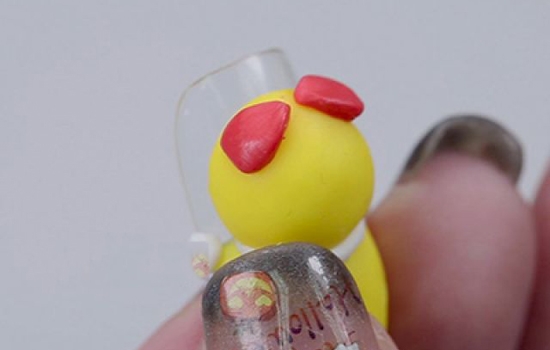第四步:搓两个红色雕花胶小球,放在哆啦美的脑袋上,用雕花笔轻拍按压,调整成一个鼓起来的小三角,但是不要把它完全拍扁!另一只也是一样的,但是要调整成三角形的尖尖向内,你能猜到这是什么嘛?照灯。