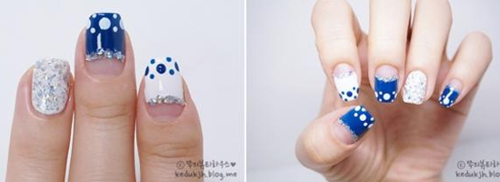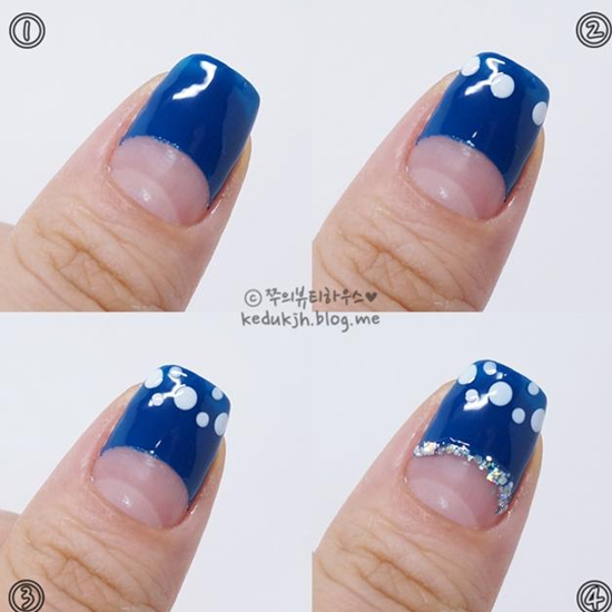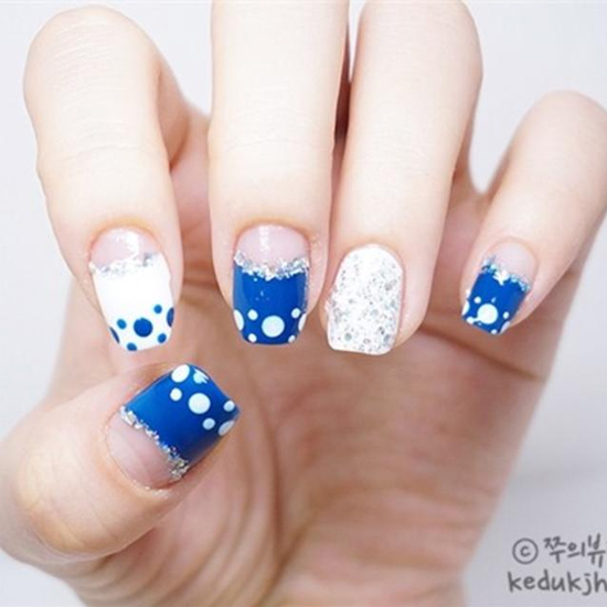 STEP4:白色的反法式上再用蓝色圆点点缀,全涂满的白色指甲上可以再涂上一层银色小亮片,5个手指有了3种图案了。