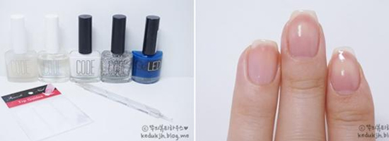 STEP1:准备法式贴纸、蓝、白、银色亮片甲油,先给指甲涂好底油。