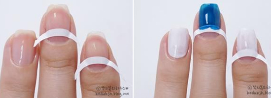 STEP2:因为做的是反法式,所以要把法式贴纸贴在靠下的位置,然后涂上白色和蓝色甲油。