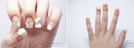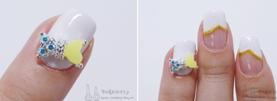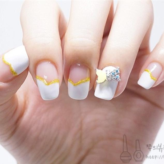 STEP4:选择金色线条的原因是,今天选择的食品是带有黄色的,这样能有所交集;将饰品略倾斜地粘在白色指甲的下方。