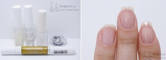 STEP1:甲油选择干净的纯白色,还要金色勾线笔和已经选好的饰品,先将底油涂好吹干。