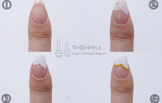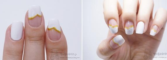 STEP2:用白色甲油在指甲上方画上两笔不对称的弧形之后填满,再用金色勾勒交界线条。