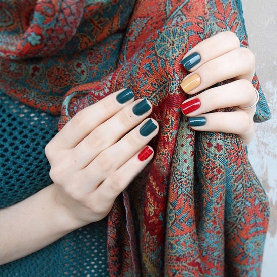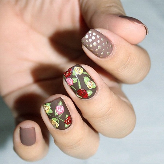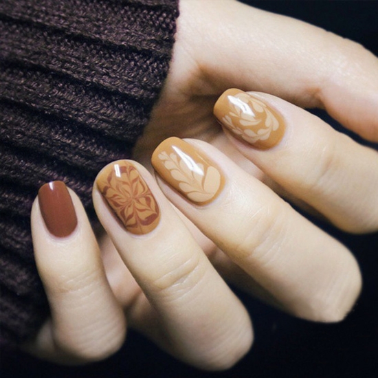 咖啡色很适合秋季,唇色的干绯色能打出高雅的感觉,咖啡色上面做彩色的图案,也能画出文艺的感觉,这种雅致和秋天更配哦。