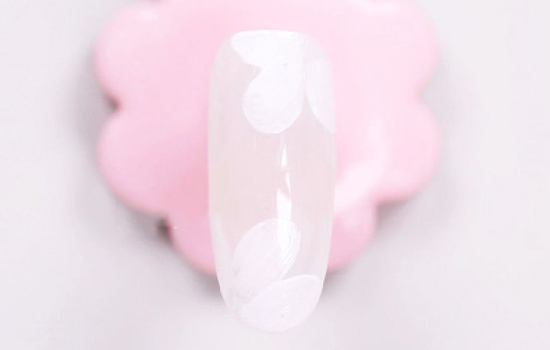 第四步:完成乳白色打底后,用圆笔沾取白色彩绘胶,在甲面的左下角画出椭圆形的花瓣,要让它们围成一朵小花哦~照灯。用同样的方法,在左上角也画出小半朵花,照灯。