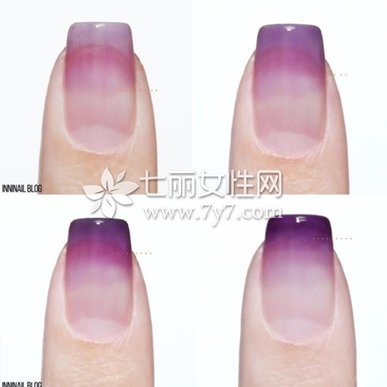 STEP3:把变淡的紫色甲油胶,从1/2部分开始,逐渐向上缩小面积叠加涂抹,直到最后顶端为最深色。
