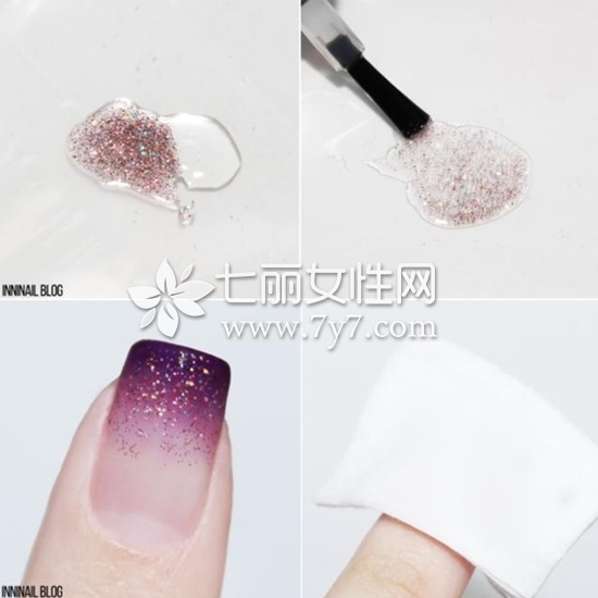 STEP4:担心亮片太密集效果不好,也可以用透明色加以调和后再涂抹在渐变紫色上,最后抹上封层,用灯照约2分钟后拿出擦拭。